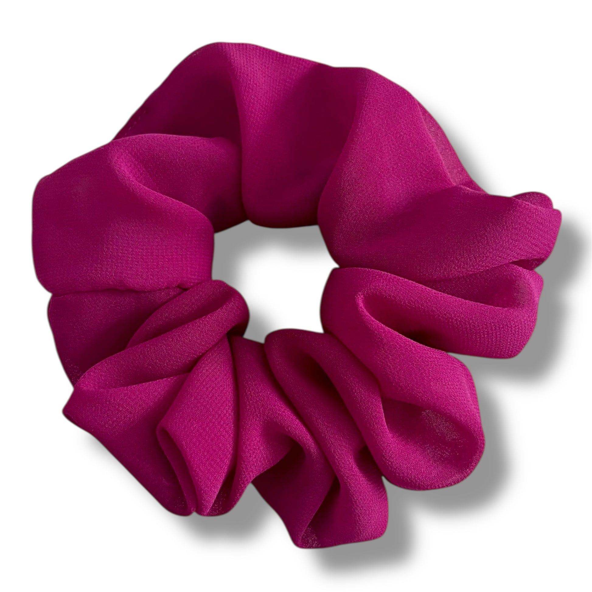 This bold and bright handmade chiffon scrunchie is a magenta/purple/pink colour. Made with quality elastic and lightweight semi-sheer chiffon.